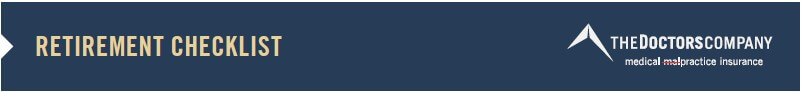 Congratulations on your retirement—we applaud your dedication to a lifetime of practicing good medicine and thank you for being a valued member of The Doctors Company. We’ve prepared this checklist to help you make a smooth transition into retirement... See the full Retirement Checklist here.
